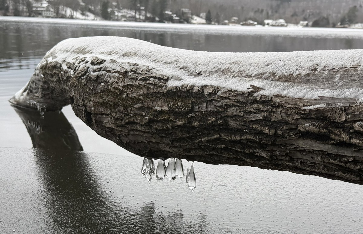 Delicate ice art, bold snow tracks, and brilliant birds were among the subjects of December’s photo submissions. Dawn Brooks discovered bear tracks in Monterey, Massachusetts; Ken Dickerman noticed “crystal bats” hanging in Barnard, Vermont; and Wendy Hutchins was visited by a young bobcat in Andover, Maine.