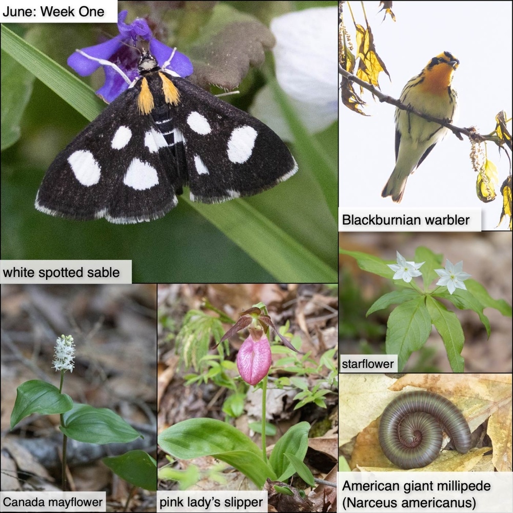 This week in the woods, white spotted sables have been showing up in meadows and (as in this photo) unmowed lawns. These tiny (about 2-centimeter wingspan) daytime moths will be flying until July. Their caterpillars feed on goldenrod.